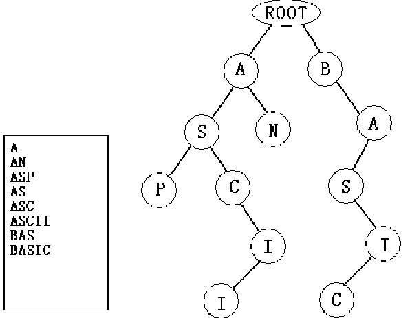 在进行文法分析的时候,通常需要检测一个单词是否在我们的单词列表里。为了提高查找和定位的速度,通常都画出与单词列表所对应的单词查找树,其特点如下: