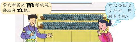 学校新买来m根跳绳,每个班分n根,最多可以分给几个班的同学,还剩多少根?(m>=n)