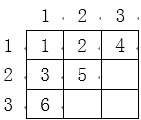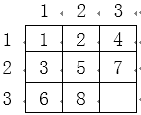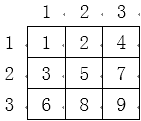 马里奥是一个快乐的油漆工人,这天他接到了一个油漆任务,要求马里奥把一个n行m列的矩阵每一格都用油漆标记一个数字,标记的顺序按照广度优先搜索的方式进行,也就是他会按照如下方式标记: