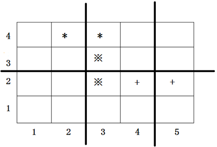 上图中用符号*、※、+标出了3对会交头接耳的学生的位置,图中3条粗线的位置表示通道,图示的通道划分方案是唯一的最佳方案。(NOIP2008年普及组复赛第2题)