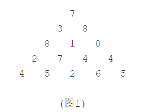 图1给出了一个数字三角形。从三角形的顶部到底部有很多条不同的路径。对于每条路径,把路径上面的数加起来可以得到一个和,你的任务就是找到最大的和。 注意:路径上的每一步只能从一个数走到下一层上和它最近的左边的那个数或者右边的那个数。