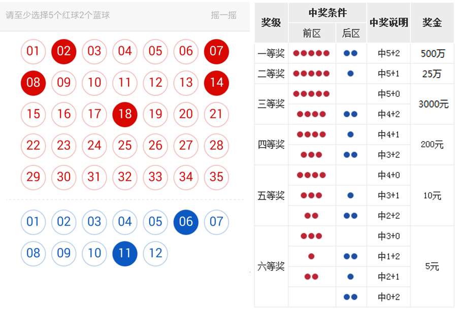 前区有14和18两个数字相同,后区6和11都相同,对照表格,中奖2+2为五等奖,奖金10元。