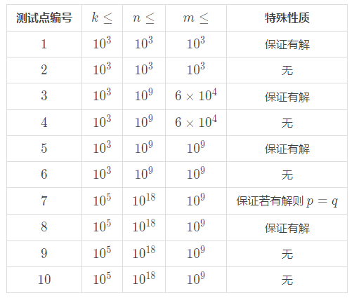 保证对于 100\% 的数据,1 \leq k \leq {10}^5,对于任意的 1 \leq i \leq k1 \leq n_i \leq {10}^{18}1 \leq e_i \times d_i \leq {10}^{18}1 \leq m \leq {10}^9