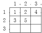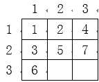 马里奥是一个快乐的油漆工人,这天他接到了一个油漆任务,要求马里奥把一个n行m列的矩阵每一格都用油漆标记一个数字,标记的顺序按照广度优先搜索的方式进行,也就是他会按照如下方式标记: