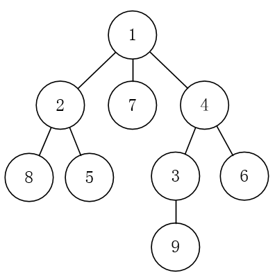 接下来n-1行,每行读入两个整数x和y,表示结点x和y之间有一条边(注意:不确定x和y的父子关系)