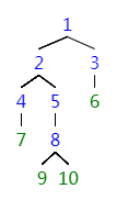 比如:下图所示的树,深度为5,宽度为3,结点7到结点9的最短距离为5。