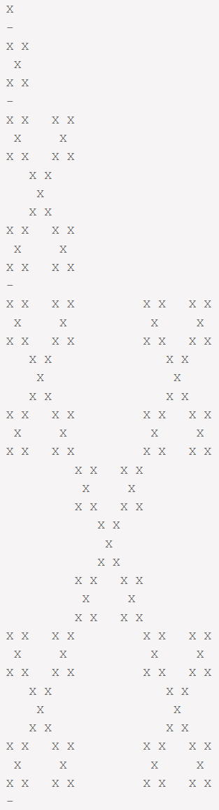 对于每组测试数据,输出要求维度的分形盒,注意X为大写字母。每组测试数据之后包含一行,改行只包含一个破折号。