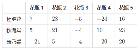 每个花瓶的形状和颜色也不相同,因此,当各个花瓶中放入不同的花束时,会产生不同的美学效果,并以美学值(一个整数 a i,j)来表示,空置花瓶的美学值为 0。在上述的例子中,花瓶与花束的不同搭配所具有的美学值,可以用如下的表格来表示: